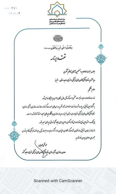 به همین منظور ، محمدتقی محمدیان، معاون ساماندهی و شبکه سازی ستاد هماهنگی کانون های فرهنگی هنری مساجد کشور در تقدیرنامه ای به همین منظور آورده است: به شکرانه این توفیق و به پاسداشت همت مضاعف شما نظر به بررسی های صورت گرفته در معاونت ساماندهی و شبکه سازی؛ ستاد هماهنگی کانون های فرهنگی هنری مساجد استان البرز در رویداد ساماندهی باشگاه بچه های مسجد ممتاز شناخته شده است.
